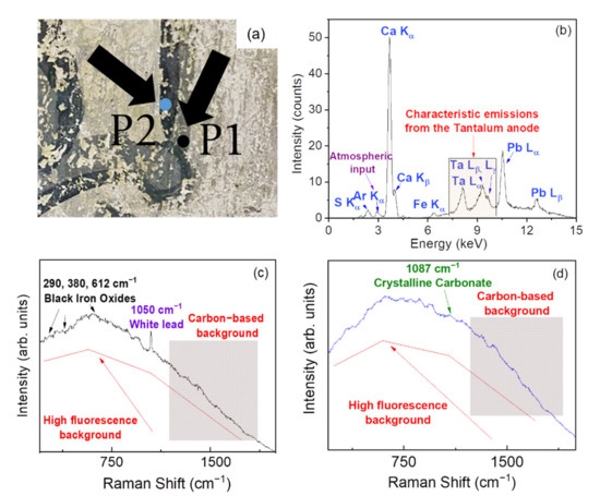 Going on, Figure 3 reports the XRF and Raman results concerning points P1 and P2 (Figure 3a), representative of a light and dark gray pigmented area of the Church, respectively.