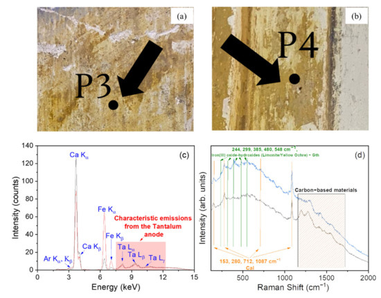 Figure 4 reports the XRF and Raman results concerning points P3 (Figure 4a) and P4 (Figure 4b), representative of a light and dark yellow pigmented area of the Church, respectively.