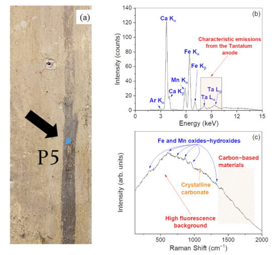 Figure 5 reports the XRF and Raman results concerning the point P5 (Figure 5a), representative of a dark brown pigmented area of the Church.