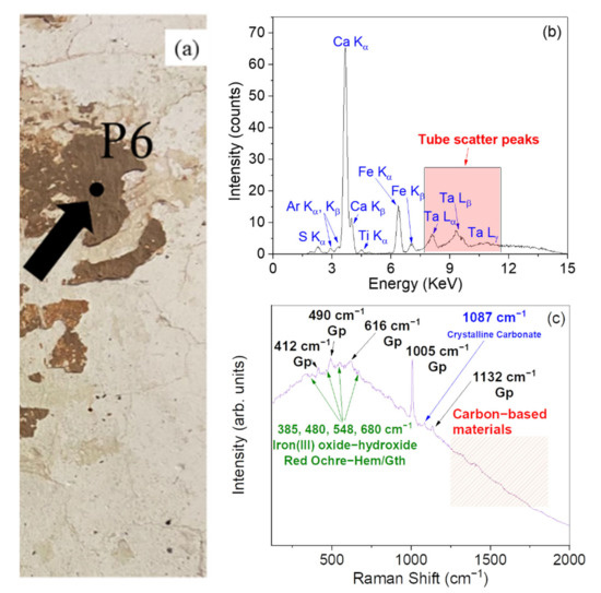 Figure 6 reports the XRF and Raman results concerning the point P6 (Figure 6a), representative of a brown pigmented area of the Church.