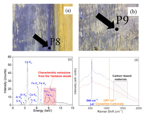 In particular, XRF spectra of points P8 (Figure 8c) and P9 (not shown) can be overlapped, indicating a similar elemental composition, with the presence of Ca, Fe, Ti, and S in quite large amounts. Going on, Raman measurements in both points (Figure 8d) show two clear peaks at ~546 and ~1087 cm−1, which can be assigned to the presence of an ultramarine blue pigment [24,36] and to the calcium carbonate (CaCO3) from preparation ground, respectively.
