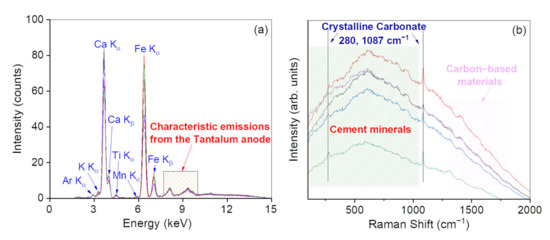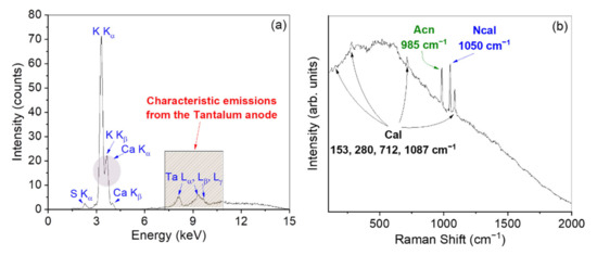 On one hand, XRF results (Figure 9a) indicate the main composition of K, Ca, and S. On the other hand, Raman measurements (Figure 9b) reveal the characteristic peaks of calcite at ~153, ~280, ~712, and ~1087 cm−1 [17,18,19]; the peak at 1050 cm−1 is assigned to the mineralogical phase of nitrocalcite (Ca(NO3)2·4H2O) [43]; the peak at 985 cm−1 corresponds to the arcanite (K2SO4) mineralogical phase [44].