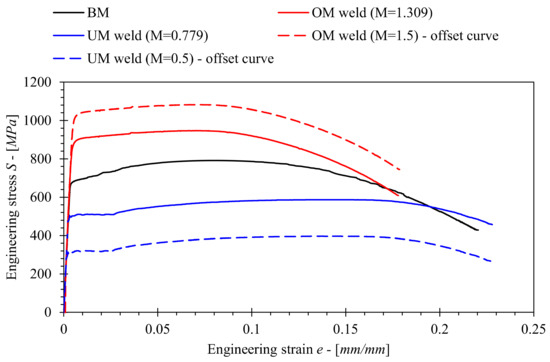 Furthermore, fictitious stress–strain curves were computed by offsetting the S-e curves for OM and UM welded joints along the slope of the linear elastic part in order to achieve mismatch factors M = 1.5 and M = 0.5 respectively. Experimental and fictitious S-e curves were then implemented in FEM in order to investigate the influence of mismatching on solutions for the J computation factors ηpl, λ and γpl.