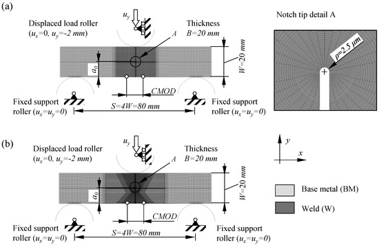 Figure 7a,b show examples of plane strain FEM models for SE(B) specimens with a0/W = 0.5 consisting of base metal and containing a welded joint (similar geometry for overmatched and undermatched welds). All other models have similar features. A conventional mesh configuration having a focused ring of finite elements surrounding a stationary crack with a blunted tip. According to SIMULIA documentation [25], contour integral (that is J in this paper) should be accurately evaluated if radius of blunted crack tip is ρ0 ≈ 10−3rp. Here, rp is size of plastic zone ahead of the crack tip that is determined according to Irwin [26] as: