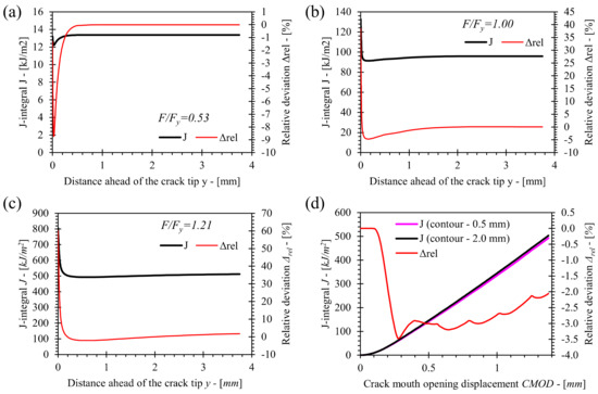 Values of ηpl were obtained from the results of numerical simulations using the procedure described in Section 4. Values of J-integral for contours at 0.5 mm and 2.0 mm ahead of the crack tip (further referred as 0.5 mm contour and 2.0 mm contour respectively) were selected for the computation of the ηpl factors. The size of the 0.5 mm contour is relatively small and is suitable for the computation of J-integral in narrow double V welds, as the contour must be located in homogeneous material at the vicinity of the crack tip. The 2.0 mm contour has been used as the reference contour, since it provides converged values of the J-integral and does not interact with concentrated deformation due to load roller contact at a high load level in case of deep cracks with a/W > 0.6. Convergence analysis of the J contour integral was performed for the plane strain model of the base material SE(B) specimen with a/W = 0.5 and standard configuration of rollers at different load levels. The load levels are (normalized by the limit load Fy): F/Fy = 0.53, F/Fy = 1 and F/Fy = 1.21; the results are shown in Figure 9a–c respectively. The analyses showed that contours close to the crack tip (y < 0.1 mm) present inconsistent values of J-integral due to severe crack tip blunting and thus deformation of finite elements closest to the crack tip. Values of J integral fully converge at a distance 2.0 mm ahead of the crack tip with exception of high load levels exceeding F/Fy = 1.21. However, the relative deviation of J values for distant contours with respect to the 2.0 mm contour is less than 2%. Further comparison of J values for 0.5 mm and 2.0 mm contours showed the deviation between both to be less than 3.2% for all load levels, as presented in Figure 9d. Here, J values for the 2.0 mm contour represented reference values for computation of the relative deviation.