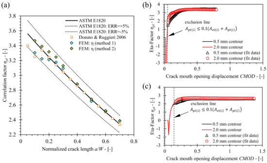 Verification of the developed finite element model has been conducted for SE(B) geometries consisting of base material only and implementing the standard configuration of load and support rollers (FEM series 1a). Obtained values of the ηpl factors for various crack lengths in the range 0.1 ≤ a/W ≤ 0.7 were compared to values were published by Wu et al. [28], Kirk and Dodds [10], Nevalainen and Dodds [29], Kim and Schwalbe [11], Kim et al. [30], Donato and Ruggieri [12] and Zhu et al. [8]. Zhu et al. compared solutions proposed by the other listed references and provided solutions for ηpl, λ and γpl, that were eventually included in ASTM E1820, by curve fitting of the compared results. In this study, two sets of ηpl values, computed from the J values obtained from FEM along 0.5 mm and 2.0 mm contours, were included in the comparison. As demonstrated in Figure 9, both sets of ηpl values closely match the existing solutions. The former showed slightly increased deviations for cracks with normalized length a/W < 0.3 and a/W > 0.5, while the latter showed excellent agreement along the entire normalized crack length range 0.1 < a/W < 0.7. This is due to the fact that convergence of J values improves with increasingly distant contours from the crack tip. The relative deviation from ηpl values included in standard ASTM E1820 is less than 5% in both cases. Additionally, it is important to emphasize that ηpl values produced in scope of this research do not exhibit increased variation for cracks with normalized length a/W < 0.2 as is the case for the solution obtained by Donato and Ruggieri [12], shown in Figure 10. The reason is that ηpl values in this paper were computed as slope of function J′pl(i) (A′pl(i)) given by Equations (11) and (12) (presented in Section 4). In contrary, Donato and Ruggieri [12] computed ηpl values as an average of function ηpl(CMOD) values that exceeded rigid exclusion condition Apl(i) ≥ A(i), where A(i) is area under P-CMOD curve. As a result, ηpl values that did not fully converge can be included in the computation of the average ηpl value for the given crack length, as shown in Figure 11b,c. Support of this discussion is shown in Figure 11a, where ηpl values computed from the created FEM by method of Donato and Ruggieri [12] follow the existing solution provided by Donato and Ruggieri. Based on the above stated arguments, it is assumed that the created FEM has passed the verification process and produces results that are in line with solutions from published researches and the standard ASTM E1820.