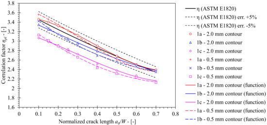 First, if the standard diameter of the load roller dL = 10 mm, implemented in FEM series 1a, is increased to dL = 25 mm, control FEM series 1b, then the ηpl decreases at maximum 3.1% with respect to the standard solution (ASTM E1820) and 5.4% with respect to the baseline solution 1a, when J from the 2.0 mm contour is considered. However, both stated solutions seem to be in close agreement when the normalized crack length is a/W ≥ 0.6.