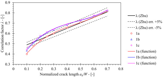 The geometry factor λ has been determined on the basis of LLD and CMOD according to Equation (14). Figure 13 presents obtained values of the geometry factor λ as a function of a/W. Figure 13 demonstrates that λ values, computed for FEM series 1a (standard roller setup) are in close agreement with solution included in ASTM E1820 for a/W ≥ 0.25. In case of shallower cracks with a/W < 0.25, computed results deviate from the standard solution. The reason is that Zhu et al. [8] produced the solution for λ by curve fitting of the existing results in the range 0.25 ≤ a/W ≤ 0.7. Further inspection of computed results shows that values of λ increase by 8.1% at maximum with respect to the reference solution for FEM series 1a if the load roller diameter is increased from 8 mm to 25 mm (FEM series 1b). However, increasing the support rollers diameter from 10 mm to 25 mm and constraining their degrees of freedom has little effect on λ values in case of FEM series 1c as computed values deviate 10.9% at maximum with respect to the reference solution for FEM series 1a. Finally, λ functions were developed by polynomial curve fitting of the computed results, using the least squares method. Proposed solutions are presented in Table 8.