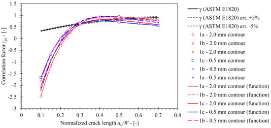 The crack growth correction factor γ has been determined from computed solutions for ηpl and λ functions and their derivatives according to Equation (14). A significant deviation of the computed γ value functions from the standard solution is observed (Figure 14). Solutions obtained from FEM series 1c and 1a deviate from the standard solution by a factor of 6.1 to 7.7 at most respectively, where J was evaluated from the 2.0 mm contour. Similarly, solutions based on J, evaluated from the 0.5 mm contour, deviated from the standard solution by a factor of 7.2 to 8.4 at most. In both cases, solutions obtained from FEM series 1b deviated from the standard solution within the specified ranges. Revision of post-processing procedures revealed that such deviations are due to the combination of ηpl, ηpl′, λ and λ′ values in Equation (14). The obtained solutions are presented in Table 9 and Table 10 for J evaluated from 0.5 mm and 2.0 mm contours.