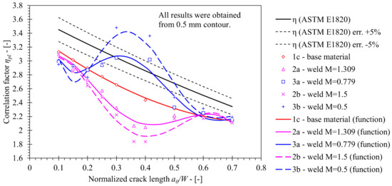 Again, values of ηpl were computed by the Eta-method described in Section 2.2 and are represented in Figure 15. All simulations implemented a fixed roller setup, which replicated the boundary conditions of the actual performed fracture toughness tests. The computed solution for the base material is plotted as the reference; several observations can be made on basis of the plotted results.