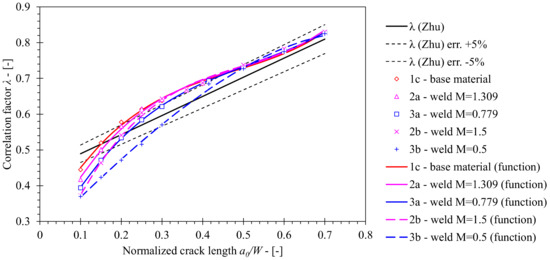 Proposed λl functions for investigated actual and altered weld material SE(B) specimens.
