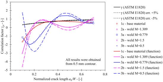 Comparison of the crack growth correction factor γ computed for weld material using FEM with standard solution according to ASTM E1820. The former has been computed for welds with various mismatch factors M. Solution obtained for the base material has been plotted as a reference.