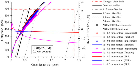 It should be noted that J-R curves for the base material (Figure 18 and Figure 19), computed with ηpl and γpl that were calibrated on basis of FEM series 1a results, are in agreement with standard J-R solutions. Here, deviations are less than 4% for the 0.5 mm contour (Figure 18) and less than 2% for the 2.0 mm contour (Figure 19). Similarly, values of JIc deviate up to 2.5% and 1.8% with respect to standard solutions for J-integral computed by 0.5 mm and 2.0 mm contours, respectively. This indicates that the FEM framework has been properly constructed. Moreover, various boundary conditions (i.e., load and support rollers setup) have an effect on J-R solutions. If the diameter of the load roller is increased from 8 mm to 25 mm as in computation case 1b, then the following observations can be made. Values of the J integral throughout the total crack extension Δa are comparable to solution 1a if ηpl and γpl, valid for the 0.5 mm contour J-integral are implemented. In contrast, values of J decrease up to 4% with respect to standard J-R solution in case of ηpl and γpl, valid for the 2.0 mm contour. Finally, if support rollers are constrained and have diameter increased from 10 mm to 25 mm as in computation case 1c, values of J-integral throughout the total crack extension Δa decrease up to 15% and 14% with respect to the standard J-R solution if ηpl and γpl, valid for 0.5 mm and 2.0 mm contours are implemented respectively. Moreover, JIc is decreased by 10.7% and 8.9% with respect to the standard solution for the 0.5 mm and 2.0 mm contours respectively. All in all, J is overestimated if the standard computational procedure is utilized to postprocess results of a fracture toughness test where the modified roller setup has been implemented.
