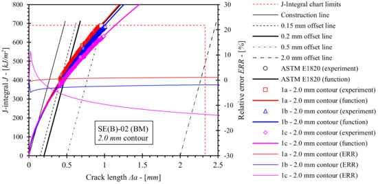 Evaluated J-R curves for base material, where ηpl and γpl functions, evaluated on the basis of numerical results, obtained from the 2.0 mm contour, were implemented. J-R curves, computed by ASTM E1820 are plotted as a reference.