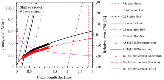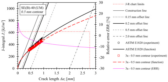 Evaluated J-R curves for base material, where ηpl and γpl functions, evaluated on the basis of numerical results, obtained from the 0.5 mm contour, were implemented. J-R curves, computed by ASTM E1820 are plotted as a reference.