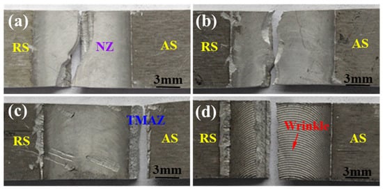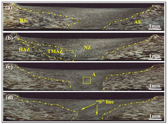 Figure 2 shows the macrostructure of FSWed joints obtained using welding speeds of 90 mm/min, 120 mm/min and 150 mm/min, 180 mm/min with an unaltered rotation speed of 950 r/min. It is observed that no grooves, holes or other welding defects exist. The well-formed weld consists of the NZ, the thermo-mechanically affected zone (TMAZ) and the heat affected zone (HAZ). As shown in Figure 2d, an “S” shaped curve appears in the weld center processed at 180 mm/min. Figure 2a,d shows the size of the NZ increases first and then decreases with decreasing welding speed. When the welding speed decreases to 150 mm/min, and the size is the largest, the internal “S” curve disappears in Figure 2c.