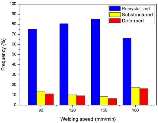 To analyze the influence of welding speed on the dynamic recrystallization behavior of plastic metal in the NZ. The IPF maps based on the EBSD technology are counted, and the dynamic recrystallization distribution made by different welding speeds is presented in Figure 4. The blue bars represent the volume fraction of the dynamic recrystallization, and the red bars express the volume fraction of the deformation in the NZ. Seen in Figure 4, the volume fraction of the dynamic recrystallization first increases and then decreases with the welding speed decreasing from 180 mm/min to 90 mm/min. When a 180mm/min welding speed is used, the dynamic recrystallization degree is the lowest, and the volume fraction is only 66.3%. Nevertheless, it is the highest, and reaches to 85.2% at 150 mm/min. Continuously reducing the welding speed to 120 mm/min and 90 mm/min, the volume fraction decreases to 80.6% and 75.1%, respectively. It is proved that the degree of the dynamic recrystallization can be increased by decreasing the welding speed.