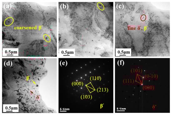 Figure 5 shows reprecipitated phase particles distribution in the weld NZ under different welding speeds. Clearly, the strengthening phase particles vary greatly. Among them, at a higher welding speed of 180 mm/min, a large number of the particles appear in the NZ in Figure 5d. With the welding speed decreasing to 150 mm/min, the phase particle distribution obviously changes and the size of the particles is finer. By the calibration of the diffraction pattern in Figure 5e,f, it is found that these fine particles are mainly composed of the reprecipitated δ’ and β’ phases. Under the condition, the welding speed gradually decreases to 120 mm/min and 90 mm/min, and some fine particles in the NZ begin to grow up and form coarse β’ phase, as shown in Figure 5a,b.
