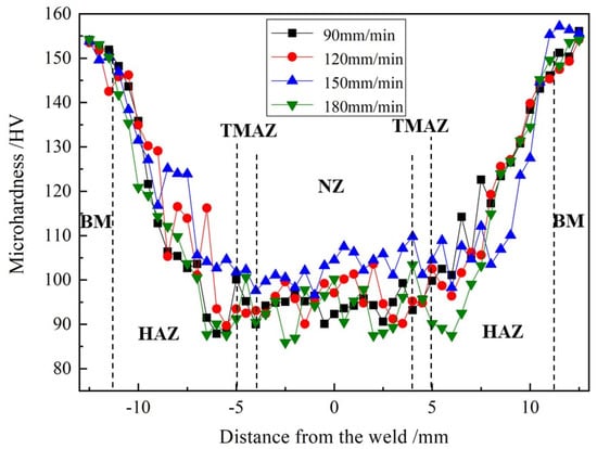 Figure 6 shows the microhardness of all FSW joints fabricated by different welding speeds. It is observed that the microhardness distribution of the joints presents a “W” shape, which indicates that the microhardness in the TMAZ and HAZ gradually decreases. The average value is minimal in the HAZ. In addition, compared with the NZ, in TMAZ and HAZ, the microhardness value of the base material is the highest, demonstrating that three zones in the weld are obviously softened. It is also found that the maximum average microhardness of the NZ is about 103 HV, made by a 150 mm/min welding speed. However, the average microhardness is only 93 HV at 180 mm/min, which is the lowest.