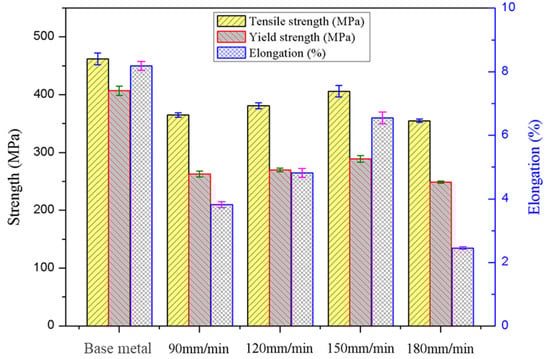 Figure 7 presents the tensile testing results of different FSW joints and base metal. It is clearly seen that the tensile properties of all FSWed joints were significantly reduced compared with the base metal. Moreover, with the welding speed decreasing from 180 mm/min to 90 mm/min, the tensile strength presents first an increasing and then decreasing trend. The mechanical performances, such as the tensile strength (TS), yield strength (YS) and elongation (EL) of FSW joints, obtained at 150 mm/min are the best, which are 406 MPa, 289 MPa and 7.2%, respectively. Whereas, the minimum value of TS, YS and EL of the joints is, respectively, 355 MPa, 249 MPa and 2.7%, when a 180 mm/min welding speed is used during FSW. This is consistent with the microstructure and microhardness of the different joints mentioned above.