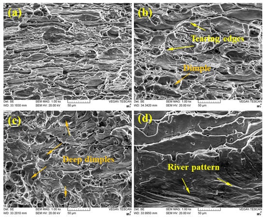 Figure 9 shows SEM images of the fractured surface of all tensile joints produced by different welding speeds. As seen in Figure 9d, a large number of river patterns and cleavage platforms are found on the fractured surface of the joint obtained at 180 mm/min, suggesting that it is a typical brittle fracture. With the welding speed decreasing to 150 mm/min, there exists a large number of deep dimples and tearing ridges on the fractured surface (Figure 9c), indicating that this fracture mode is a complete ductile fracture. For FSW joints of 120 mm/min and 90 mm/min, fine dimples and few tearing ridges on the flat facets indicate a mixed fracture mode appearing in the NZ, as shown in Figure 9a,b.