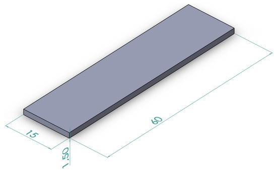 The samples were made in the form of flat bars (cuboidal) with the dimensions of 1.5 mm × 15 mm × 60 mm (Figure 2 and Figure 3) and then electroerosively cut with the use of a WEDM cutting machine and a BP05d electro-erosion machine (Zakład Automatyki Przemysłowej B.P., Konskie, Poland) into smaller sections (5 mm × 5 mm × 1.5 mm). All of the samples prepared in this way were subjected to supersaturation at the temperature of 570 °C/2 h and ageing at the temperature of 170 °C. The ageing times were 2 h, 4 h, 6 h, 8 h and 16 h, respectively.