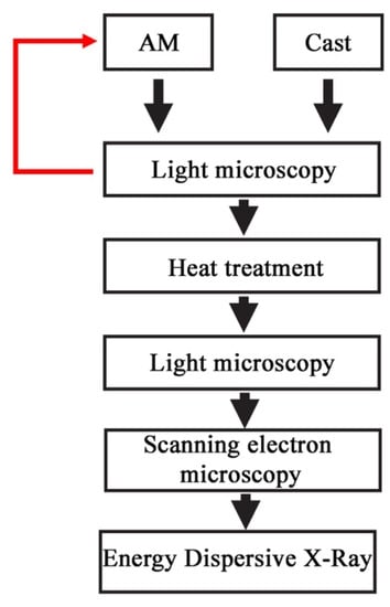 After the heat treatment processes, the metallographic sections were prepared. Samples were polished—first with 600–2000 grit abrasive papers and then in 0.04 mm gradation OPS slurry. Figure 4 shows the research schedule. In order to reveal the structure, microscopic examinations were carried out using light microscopy (LM) and scanning electron microscopy (SEM). For light microscopy examination, the Leica LM/DM (Leica, Wetzlar, Germany) light microscope was used and for SEM examination the Phenom XL (Thermo Fisher Scientific, Waltham, MA, USA) and Hitachi SU-70 (Hitachi Ltd., Tokyo, Japan) microscopes were used.