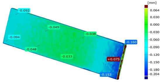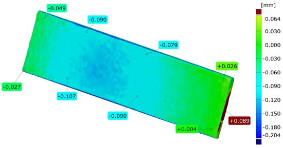 The results of the 3D laser scanning tests of samples made of AlSi10Mg-cast (Figure 5) and DMLS (Figure 6). The geometric measurements of the samples show that they show high dimensional accuracy both in the condition after casting and when made by the DMLS method. The dimensions change due to shrinkage during the cooling of samples, where the maximum deviation of <0.1 mm for cast samples was achieved, and for DLMS it was <0.5 mm in the central part and less than 0.1 mm at the edges. The performed measurements indicate a very high dimensional accuracy of the samples made using the DMLS method.