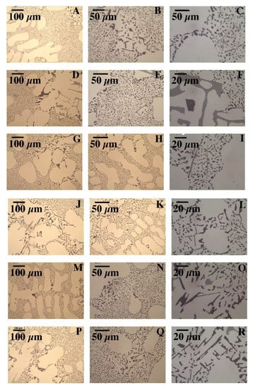 Microstructure of cast samples before and after heat treatment (LC): (A) after casting, (B,C) after supersaturation, (D–F) after supersaturation and ageing—2 h, (G–I) after supersaturation and ageing—4 h, (J–L) after supersaturation and ageing—6 h, (M–O) after supersaturation and ageing—8 h and (P–R) after supersaturation and ageing—16 h.