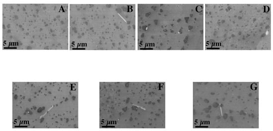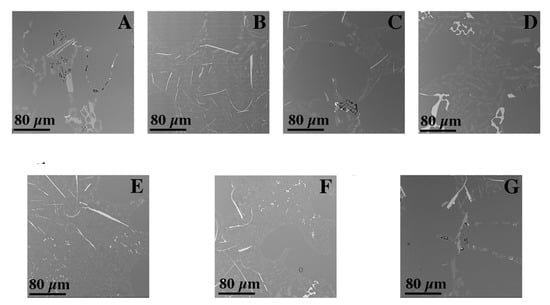 Microstructure of cast samples before and after heat treatment (SEM): (A) after casting, (B) after supersaturation, (C) after supersaturation and ageing—2 h, (D) after supersaturation and ageing—4 h, (E) after supersaturation and ageing—6 h, (F) after supersaturation and ageing—8 h and (G) after supersaturation and ageing—16 h.