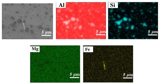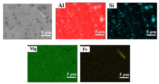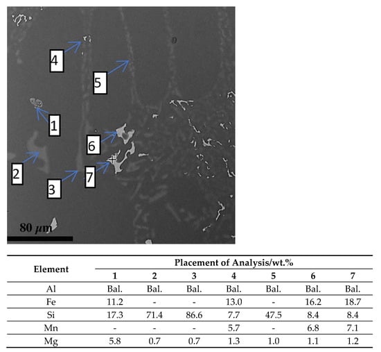 The microscopic tests performed show the dendritic structure of the samples after the casting process, typical for the crystallization of the castings. In the interdendritic regions, lamellar and globular precipitations were observed, indicating segregation of the alloying elements during crystallization and their pushing into the interdendritic regions (Figure 9 and Figure 10). Regardless of the thermal treatment performed, the dendrite cores remained free from precipitation, and the morphology of the precipitates did not change. Chemical composition analysis (EDS) shows that these precipitates, depending on the morphology, are rich in silicon, iron and magnesium (Figure 11).