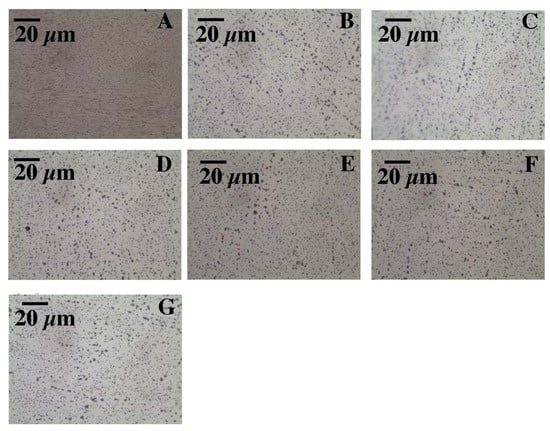 Microstructure of DMLS samples before and after heat treatment (LM): (A) after DMLS, (B) after supersaturation, (C) after supersaturation and ageing—2 h, (D) after supersaturation and ageing—4 h, (E) after supersaturation and ageing—6 h, (F) after supersaturation and ageing—8 h and (G) after supersaturation and ageing—16 h; Observation of the cross-section in the middle of thickness for each sample.