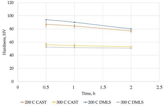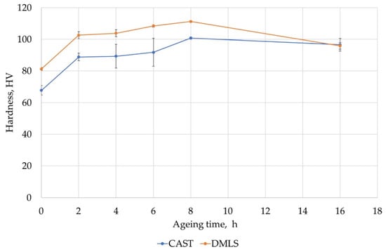 The DMLS samples after supersaturation had a hardness of 80 HV0.2, which increased after ageing for 8 h to 113 HV0.2. After 16 h of ageing, a decrease in hardness to 98 HV0.2 was observed (Figure 16), which indicates the beginning of the overageing process. Further extending heat treatment time results in further hardness decrease.