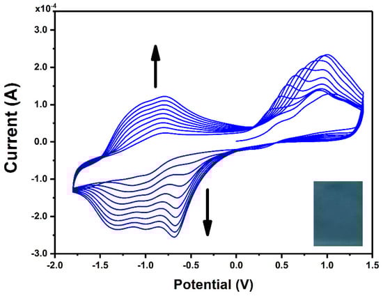 Figure 1 presents CV curves recorded during continuous scanning in an electrolyte solution containing ZnPcNH2. In the first anodic scan, an irreversible oxidation can be observed at ca. 0.75 V vs. Ag, which can be assigned to the oxidation of the primary amino group of ZnPcNH2 to a radical cation, similar to the electro-oxidation of the aniline monomer [35]. A steady increase in the registered current in the broad potential range during continuous scanning can be observed, confirming the formation of the electroactive layer on the surface of the ITO electrode. The newly occurring redox couples at ca. −0.75 V and −1.25 V arise from the electrochemical activity of the ZnPc layer [36,37,38,39]. In the course of the 10 scan cycles of the electrodeposition process, a uniform blue-green (ZnPcNH2)layer was synthesized on the ITO surface (Figure 1 inset).