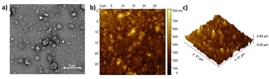The morphology of the layer was investigated using scanning electron microscopy (SEM) and atomic force microscopy (AFM). SEM images were acquired using Phenom ProX with an accelerating voltage equal to 15 kV and a magnification between 15,000× and 20,000×. The samples were sputter coated with 10 nm of gold film (Q150R Quorum Technologies, Laughton, East Sussex, UK) before SEM imaging. The images were analyzed with Phenom software. AFM investigations were conducted using Nanosurf CoreAFM working in a contact mode with the standard contact-mode AFM HQ:CSC17/Al BS (MikroMasch, Tallinn, Estonia) probe (resonance frequency 13 kHz; force constant 0.18 Nm−1). The images were processed with the use of Gwyddion SPM (Brno University of Technology, Brno, Czech Republic).