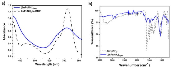 The optical properties and the chemical structure of (ZnPcNH2)layer were characterized by UV–Vis and IR spectroscopies, respectively. UV–Vis spectra of the solution of ZnPcNH2 in DMF and (ZnPcNH2)layer deposited on ITO are presented in Figure 3a. The characteristic B (Soret band) and Q bands (π → π* transition band) for ZnPcNH2, both in a solution phase and in the form of a layer, can be observed at ca. 350 nm and 720 nm, respectively. The latter is significantly broadened in the case of the layer, possibly due to the aggregation of ZnPc molecules [36,43,44]. Notably, the deposited Pc layer exhibits strong and broad absorption in the visible range, which should be advantageous for a white light-driven photosensitization process.
