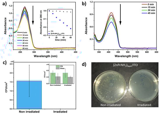 In the next step, the process of ROS photogeneration by the electrodeposited Pc layer was investigated under white light illumination, using indirect ROS detection employing UV–Vis spectroscopy to follow the changes in the concentration of α-terpinene, i.e., a chemical trap [49]. An exemplary UV–Vis spectra of α-terpinene in ACN recorded in the course of the illumination of (ZnPcNH2)layer/ITO are shown in Figure 4a. A successive decrease in the absorbance of α-terpinene at 266 nm can be observed, when (ZnPcNH2)layer is illuminated. Notably, the drop is significantly higher than in the case of uncovered ITO (Figure 4a, inset). This confirms that the chemical trap reacts with ROS produced by the Pcs-containing layer [50]. Importantly, since no new band arises in the UV–Vis spectra during the photoprocess, it can be stated that (ZnPcNH2)layer is stable and that the immobilized photosensitizers are not released into the environment.