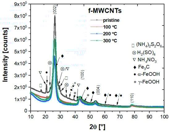 The XRD patterns for all the f-MWCNTs specimens studied are shown in Figure 1. The XRD pattern for each studied nanotubes is complex is dominated by the presence of indexed peaks such as (002), (100), (004), and (110) at 2θ = 26.34°, 43.35°, 56.86°, 78.48°, respectively, according to ICDD reference 00-058-1638. Nevertheless, impurities as post-functionalization products are evidenced and marked by additional peaks according to the ICDD database (see Figure 1). One can notice the presence of ammonium nitrate NH4NO3 (ICDD 00-047-0864), ammonium sulfate (NH4)2S2O6 (ICDD 00-015-0241), and sulfuric acid H2SO4 (ICDD 04-014-6906). As can be seen, most of the organic impurities observed in the as-received nanotubes are removed after the calcination process. The analysis of the XRD pattern of the nanotubes is not trivial, mainly because we cannot exclude the presence of turbostratic carbon, visible as asymmetric peaks considered due to disordered graphene layers [,]. Indeed, TEM analysis revealed defects and damaged walls (see Figure 2). Furthermore, it has been shown that NH3 treatment can promote the formation of the turbostratic structure []. In addition, published results point out the presence of iron carbides (mainly) cementite during the synthesis of CNTs []. Other Fe-based contributions as catalyst residues are also discussed and studied [,,,,,,,,,,,,,]. However, the exact identification of each crystal phase of iron form and their content by XRD measurements is complicated due to their crystalline structures similarities.