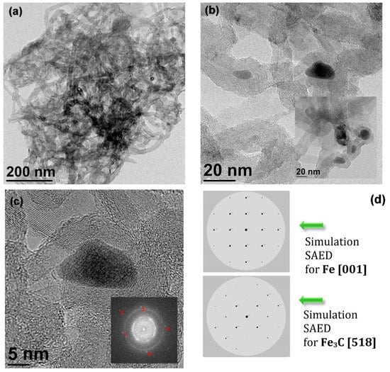 TEM image for pristine f-MWCNTs (a) entangled nanotubes; (b) nanotubes with visible Fe-based catalyst residues; (c) Fe-based nanoparticle with FFT analysis placed as insert; (d) selection area electron diffraction (SAED) pattern simulation of Fe [001] and Fe3C [518] phases.