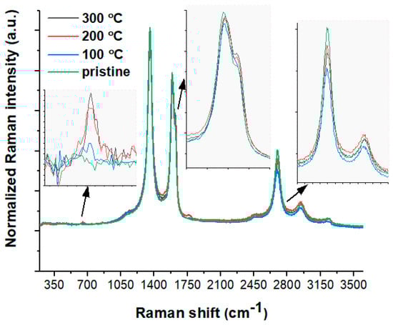 The Raman spectra of the studied CNTs also revealed the D* band at about ~2690 cm−1, which is the second harmonic of the D band (see Table 1) [,]. According to the literature, the intensity of the D* band corresponds to the extent of impurities in the sample [] or results from the mass fraction, i.e., the decrease in D* intensity translates into a decrease in the CNT mass []. A very similar arrangement of Raman bands was found for the heat-treated samples with only slight differences in intensity and band positions (see Table 1).