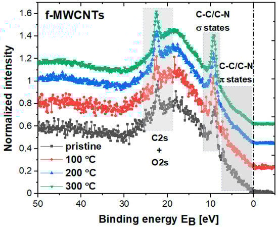 The electronic structure of various carbon nanotubes can be effectively studied by XPS measurements [,,,,,,,,,]. However, it is important to remember first that the sensitivity of XPS is limited to the surface with a depth of about 10 nm for the monochromatized Al source. The changes in the valence band (VB) spectra as a function of sample treatment are illustrated in Figure 4. There is no significant difference in VB between all samples, meaning that the calcination process did not affect the high degree of crystallinity of the CNTs wall structure. However, after annealing at 300 °C, a slight increase in the states around the Fermi level (EF) can be noted, which can probably be associated with the influence of the Fe-based magnetic components modified over heat treatment. Nevertheless, such states with a noticeable bump around 4.1 eV may also be evidence of sp2 hybridized nitrogen as photoelectrons emitted from nitrogen lone pair states, as already demonstrated by Ruelle et al. [].