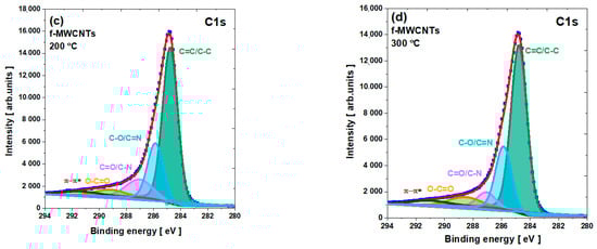 The C1s core level line for f-MWCNTs: (a) pristine; calcined at (b) 100 °C; (c) 200 °C; and (d) 300 °C.