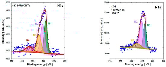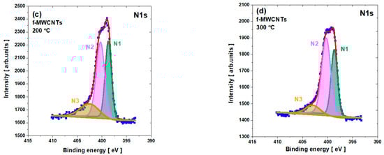 The N1s spectra of pristine and calcined nanotubes reveal several contributions related to N-based functionalities (see Figure 6), namely N1, N2, N3, and N4 (see Table S2 in Supplementary Materials). The N1 peaking around 399 eV can be identified as pyridine and nitryl groups; N2 around 400 eV to amide, amine, lactam, and pyrrole; the N3 observed around 402 eV to quaternary nitrogen atoms bonded to three C atoms in the bulk of the graphene layers; the broad N4 peak around 406 eV to pyridine-N-oxide overlapped with probably dominated adsorbed N2 [,,,]. The relative percentage of the different N-species was determined for each sample based on the deconvoluted spectra. For the pristine f-MWCNTs, we observe all four nitrogen-based lines, whereas, for the calcined specimens, only three components are visible with different relative percentage contributions. Moreover, the N2 component dominates for both pristine and calcined nanotubes. This contribution is probably enhanced with Fe–N states due to the presence of Fe/Fe3C catalyst residues []. N3 is reduced after calcination to about 9 at. % for the sample calcined at 300 °C. The modification of the nitrogen-based group during the calcination process has already been observed, for example, by Kundu et al. [], who studied CNTs heat-treated under NH3 at different temperatures. As in the case of our samples, he determined the domination of the N2 states for the sample annealed at 200 °C.
