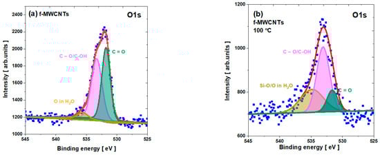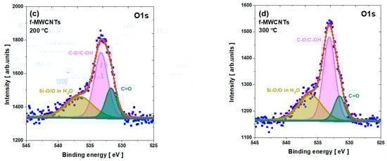The O1s line is complex for all the nanotubes studied and can be attributed to three species (see Figure 7) (see Table S3 in Supplementary Materials). The complexity of the O1s line can be derived from various components related to C=O (BE ≈ 531.6 eV), C–O/C–OH (BE ≈ 533.2 eV), and the peak at about 536 eV. The first peak dominates pristine nanotubes, while the second is dominant for calcined nanotubes. Moreover, the last peak for the pristine f-MWCNTs can probably be caused by physisorbed water as an effect of functionalization in the wet environment, while for the calcined samples, this peak becomes very broad, probably due to the overlap with the Si–O states as an effect of the nanotube annealing on the quartz boat. It should also be emphasized that the second peak can be enhanced by the N–O bonding sites generally noticeable around 534 eV.