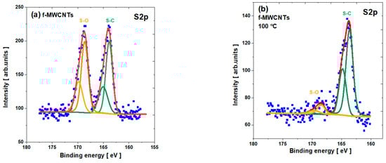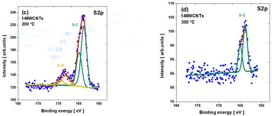 The analysis of the S2p spectra indicates a small contribution of the sulfur-based components (see Figure 8) as residues from the purification of the nanotubes (see Table S4 in Supplementary Materials). Nevertheless, the sulfur line exhibits two prominent peaks that can be recognized as C–S–C and S–O states. The first is visible as two distinct peaks S2p3/2 and S2p1/2, around BE ≈ 163.7 eV and BE ≈ 164.9 eV, respectively, and probably enhanced by the Fe-S states []. The second states are also revealed by two peaks, S2p3/2 and S2p1/2, around BE ≈ 168.5 eV and BE ≈ 169.7 eV. In the case of pristine nanotubes, both sulfur states are noted. However, as can be observed, the calcination procedure slightly reduces the S–O states until they disappear entirely after annealing at 300 °C. Concomitantly, sulfur-carbon states as a covalent bond are visible for all the studied samples.