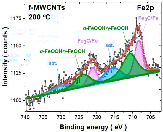 The example of the Fe2p line measured for f-MWCNTs calcined at 200 °C is shown in Figure 9 (see Table S5 in Supplementary Materials). The deconvolution was performed based on the Doniach–Sunjic (DS) line shape []. Obviously, the iron line is rather weak due to the low iron content of the sample. The peaks around 708 eV and 721 eV can be assigned to overlapped states of Fe3C (cementite) and Fe with a dominant contribution of iron carbide [,,]. The next two broad peaks around 710.6 eV and 723.8 eV are rather ascribed to γ–FeOOH (lepidocrocite) or/and α–FeOOH (goethite) states [,]. According to previous studies, the binding energy difference between the two components is only 0.1 eV [,]. Considering the sensitivity of our spectrometer, which is about 0.3 eV, we are not able to precisely distinguish which component dominates in the studied material. Instead, we can deduce that it could be a convolution of the two species due to the broad peaks. There are also two additional satellite peaks. The relative contribution of each state estimated based on the deconvolution is about 31.3 at.%, 44.5 at.%, and 24.3 at.%, respectively. Thus, it appears that based on the fit of the Fe2p photoemission line, the overlapping goethite/lepidocrocite states dominate that of cementite. However, one should be aware that a broad satellite structure may be composed of states assigned to both Fe-based contributions, and their ratio can be disturbed.