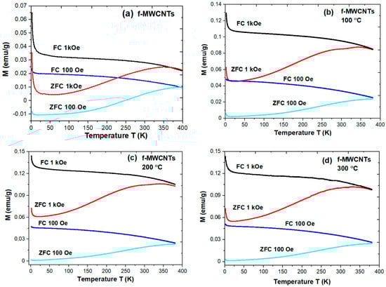 The thermal evolution of the magnetization measured under zero-field-cooled (ZFC) and field-cooled (FC) conditions under an applied field of 1 kOe and 100 Oe is depicted in Figure 10. As one may notice, the magnetization is relatively lower for pristine nanotubes than for calcined ones. In addition, for calcined nanotubes, the modification of thermal dependence of magnetization seems to be independent of the calcination temperature. However, it is worth noting that the estimated difference MFC-MZFC is slightly dependent on calcination procedure from about 0.029 emu/g (pristine) to 0.048 emu/g (calcined at 300 °C) and 0.031 emu/g (pristine) to 0.070 emu/g (calcined at 300 °C) estimated at 100 Oe and 1 kOe, respectively. Thus, the observed differences can probably be related to variation within Fe-based components modified over calcination. The difference in the ZFC and FC curves and their divergence above room temperature revealed some thermal blocking effects, usually attributed to magnetic anisotropy. Indeed, the maximum occurrence in ZFC curves can be associated with the blocking process of some Fe-complexes as nanoparticle catalyst residues. The observed M(T) variations are relatively consistent with previously published results [,]. Jamrozik et al. [] revealed that the M(T) dependence at a lower temperature for all studied nanotubes is different than expected for pure cementite, suggesting the influence of additional iron-based species, which lead to a slight increase in magnetization with decreasing temperature. As the authors claim, the magnetization results demonstrate a predominant amount of iron in the ferromagnetically ordered (or in the form of superparamagnetic particles) cementite phase. Smaller magnetization values for MWCNTs samples than that of bulk Fe3C can also be caused by some additional diamagnetic elements such as oxygen present in the samples [,]. Indeed, as shown by XRD and XPS analysis, the diamagnetic elements are observed in all studied samples, but their relative contribution is reduced after calcination. Probably, therefore the magnetization is lower for pristine nanotubes than for annealed ones (see Figure 10). In addition, we also observe an evident increase in magnetization at the low-temperature range (below 20 K for 1 kOe and below 12 K for 100 Oe), which points to the conclusion that probably in our samples, there are more than one Fe-based species.