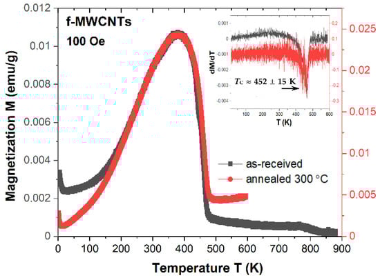 The MZFC(T) high-temperature measurements performed for pristine and calcined at 300 °C nanotubes allow determining the phase transition temperature for magnetic component dominated in f-MWCNTs. Between 400–500 K, the evident phase transition can be noted. The performed dM/dT differentiation allows estimating the value of the Curie temperature, which equals TC ≈ 452 ± 15 K. As previously discussed, in the studies samples, we can distinguish several types of Fe-based structures with the evident influence of Fe3C. Cementite is a metallic ferromagnet transforming to the paramagnetic state at a Curie temperature of about TC = 483 K []. In our case, such temperature is lower, but as evidenced, the presence of other magnetic Fe-based components cannot be neglected. Indeed, Lee et al. [] revealed the magnetic phase transition for goethite (α-FeOOH) and lepidocrocite (γ-FeOOH) nanoparticles. Both crystallize in the orthorhombic structure and show the antiferromagnetic arrangement with the Néel temperature TN = 252 K and 53 K, respectively. Such values are lower than bulk materials, e.g., for bulk α-FeOOH, it equals about TN = 372 K []. Thus, the origin of the broad peak observed for f-MWCNTs may comprise the overlapped magnetic phase transition of dominated cementite and partly goethite. The influence of lepidocrocite is low and can be noted by a weak inflexion point around 50 K. However, there is an additional peculiarity between 750 K and 850 K as the induced heat-treatment phase transition during heating the sample under measurements conditions above 300 K. As evidenced by Boi et al. [], the decomposition of γ-Fe into α-Fe starts even at temperatures below 200 °C and is significantly faster in the temperature range of 300–399 °C. However, such a phenomenon occurs in a strictly controlled environment without possible oxidation. The magnetic transition presented in Figure 11 at high temperatures is lower than for typical α-Fe, which may indicate that the Fe-oxides are probably generated during measurements.
