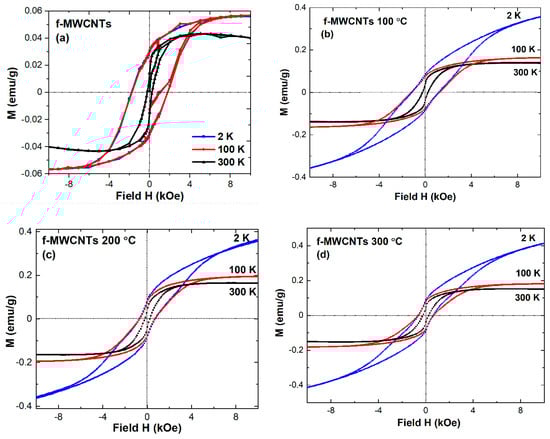 Hysteresis loops M(H) measured at 2 K, 100 K, and 300 K for f-MWCNTs: (a) pristine; (b) calcined at 100 °C; (c) calcined at 200 °C; (d) calcined at 300 °C.