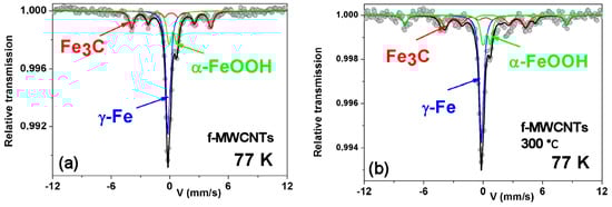 Mössbauer spectra measured at 77 K for f-MWCNTs: (a) as-received; (b) calcined at 300 °C.
